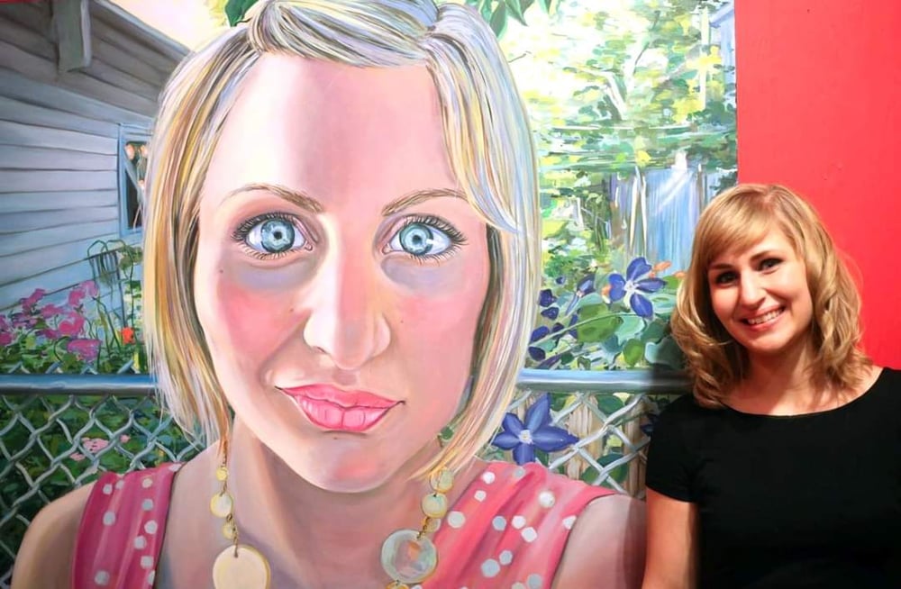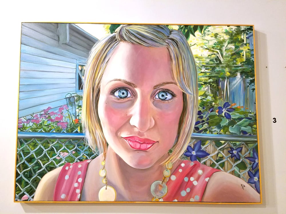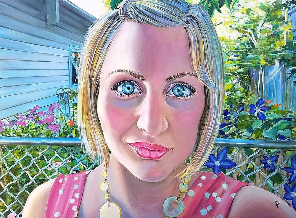 Artist's self-portrait conveying a moment of present happiness, clarity, nature, privacy, and oneness. In an era of broadcasting the self, Renaudin works to invoke the feelings of peace and balance organically. Ironically, she wanted to portray this in a viewpoint of the iconic Selfie within an enclosed space. The overpowering one-point perspective of the shrouded garden signifies a secret and special place away from the noise of the world.