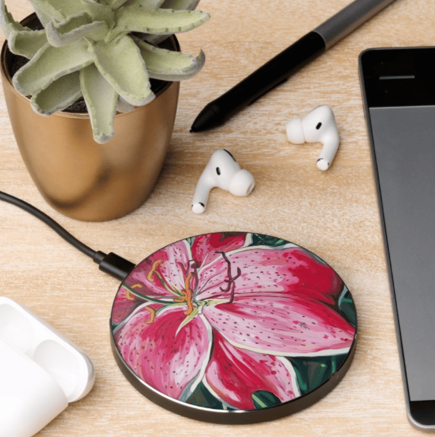 This Spoke wireless charger is there to get the job done! Its sleek and durable design is wireless charging compatible. The design is located beneath the acrylic faceplate, so rest assured, it won’t scratch or fade over time.