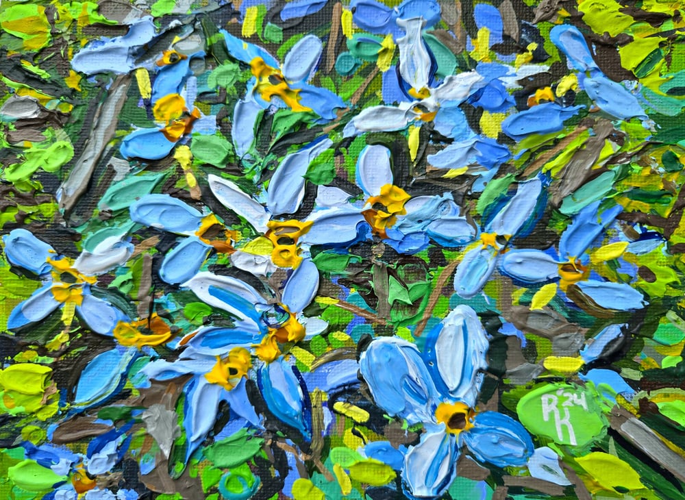 Small-scale knife painting of impressions of a grouping of forget me nots.