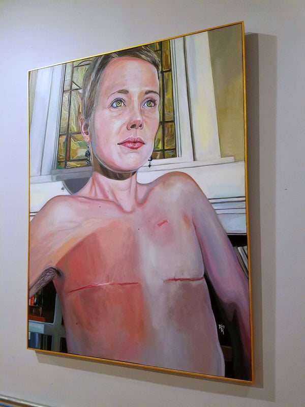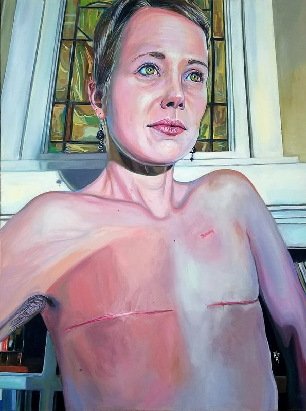 Here is a live depiction of a woman who, at 29 years old, got diagnosed with stage II breast cancer. The moment was captured right after she had finished her last radiation treatment and had finished healing from her bilateral mastectomy. This painting is an open and proud statement of inner consciousness transcending the flesh through an epiphany of finding new personal strength after a hard-fought victory. Her stoic contrapposto boldly celebrates her scars as a triumph. The highly angled composition of the environment simultaneously works to imbue her presence and direct complete attention to the figure while the stained-glass window that halos her head reflects her newfound glory.